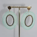 These sophisticated oval earrings feature a gold-tone frame beautifully adorned with soft mint-green beads, offering a fresh and elegant look. The intricate beadwork creates a delicate texture, while the subtle shimmer adds a touch of glamour. Finished with a textured stud, these earrings are perfect for adding a refined pop of color to any outfit, whether for a casual day out or a special event.