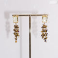 These exquisite earrings feature a sparkling square-cut crystal stud, from which a cascade of shimmering, gold-tone clusters elegantly dangles. The combination of faceted crystals and delicate chains creates movement and an eye-catching sparkle, adding sophistication and glamour to any ensemble. Ideal for special occasions or when you want to make a dazzling impression.